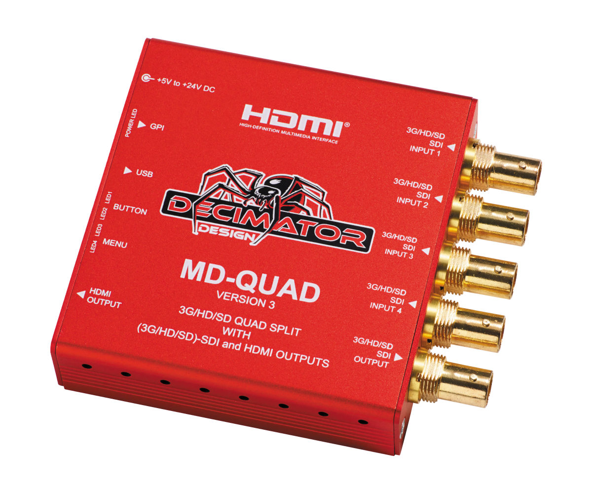 Combine up to four 3G/HD-SDI channels into a single split screen output over HDMI or SDI with the Decimator MD-Quad splitter.