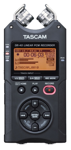 With two XLR inputs and a built in stereo microphone the DR-40 is a compact field recorder that's useful for recording audio on shoots where the camera is lacking proper audio inputs and controls.